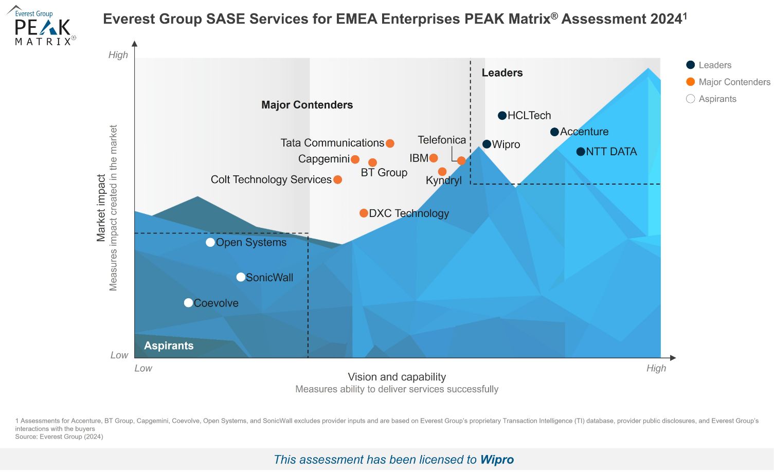 Wipro has been recognized as a Leader in Everest Group’s SASE Services for EMEA Enterprises PEAK Matrix® Assessment 2024. As part of Everest Group’s ongoing analysis of the SASE services market, 15 leading SASE providers were assessed based on their internal capabilities, strategic partnership strengths, proprietary tools and IPs, accelerators, AI innovations, and client reference checks.