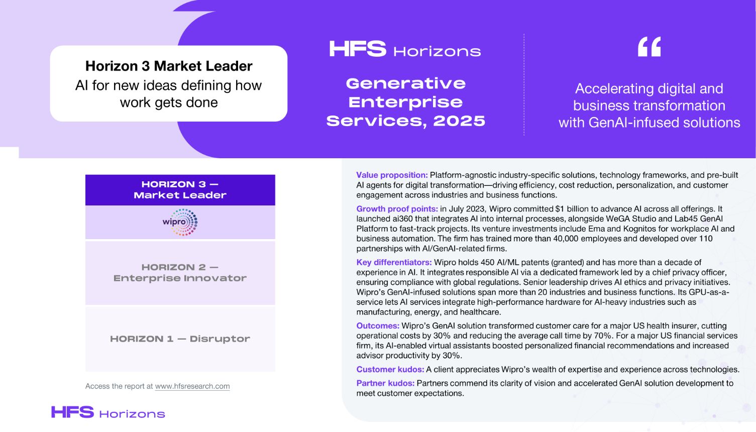 In the report, HFS assessed service providers’ progress on GenAI promises, investigating the delivery of profound, clear, and scalable value to enterprises. Wipro’s successful delivery of past AI commitments is highlighted in HFS Horizons: Generative Enterprise Services, 2025 report.