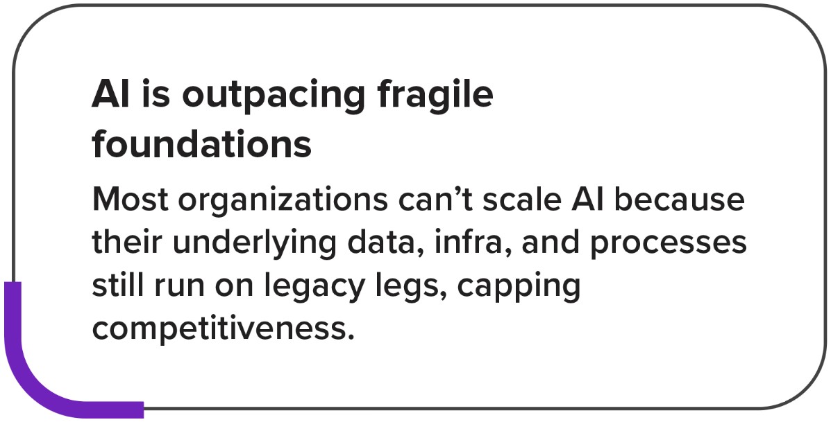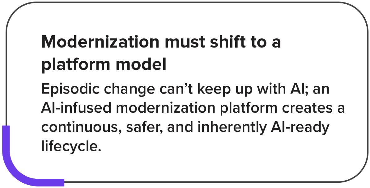 Enterprises aren’t failing at AI because of weak algorithms – they’re failing because transformation still runs on project-based, effort-heavy models. HFS Research shows that 80% of G2000 organizations remain stuck in experimentation due to fragmented systems and inconsistent delivery approaches. Enterprises are under pressure to modernize their technology landscapes to keep pace with rising AI ambitions. This convergence is intensifying modernization fatigue, even as AI raises expectations for speed and scale. As a result, modernization is now viewed as a prerequisite for unlocking the full value of AI. To meet this new mandate, organizations must embrace a platform‑driven transformation that reimagines every stage of the enterprise modernization lifecycle.