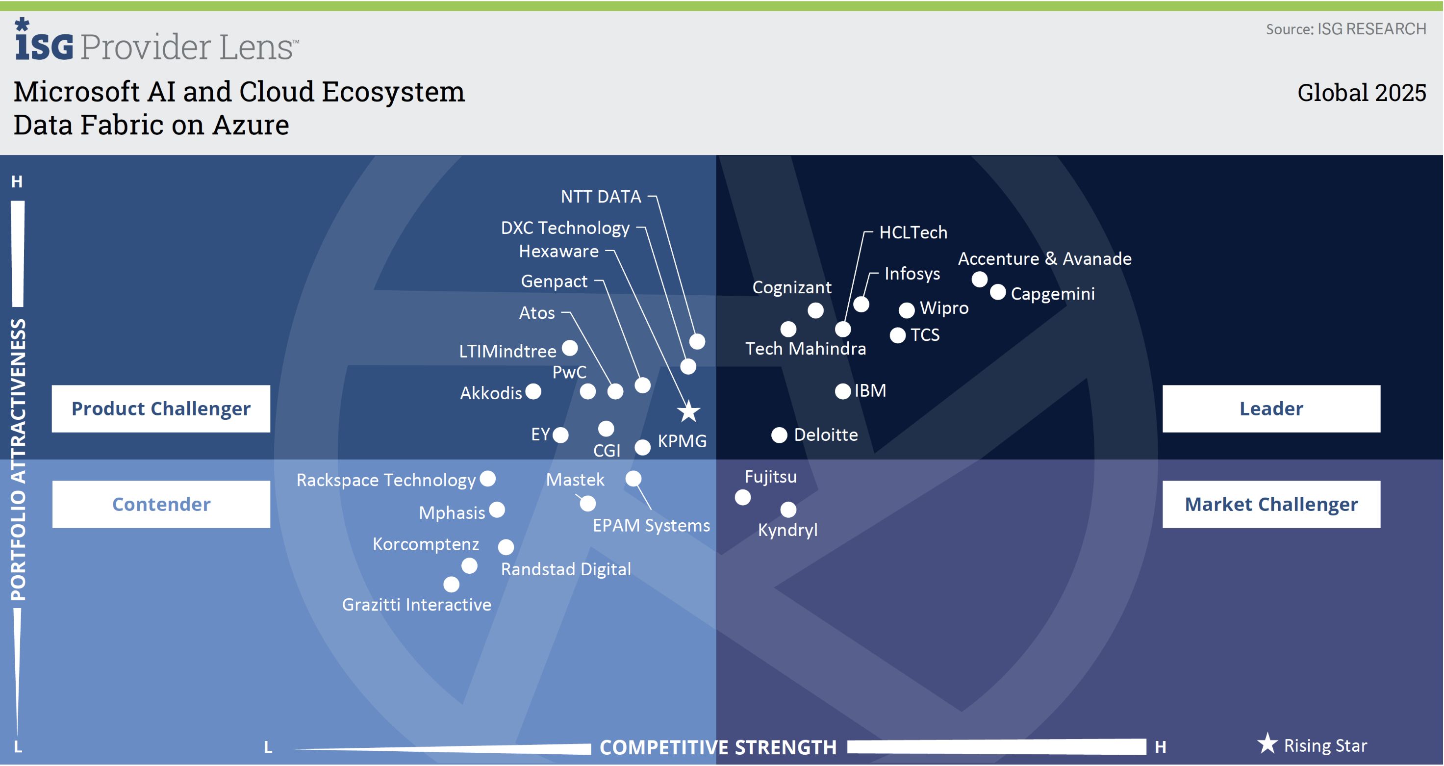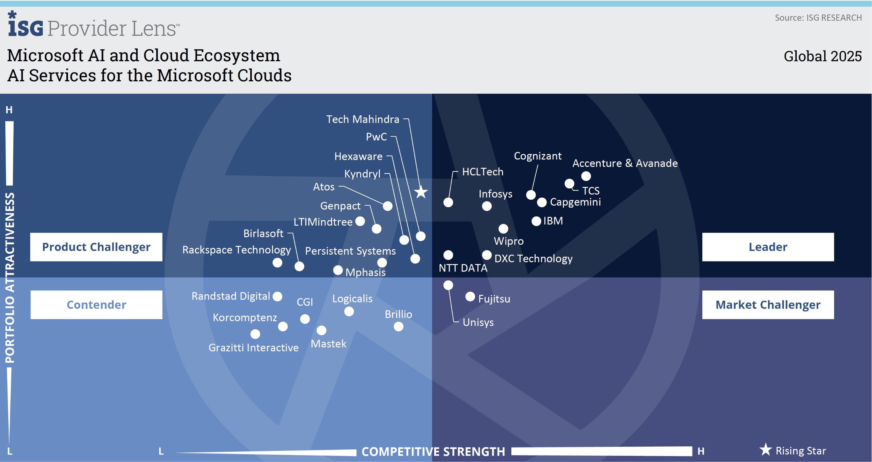 Wipro is recognized as a Leader in the ISG Provider LensTM Global study for Microsoft AI and Cloud Ecosystem 2025 across multiple segments. This study assesses providers' capabilities based on their product and service portfolio and competitiveness within the Microsoft AI and Cloud ecosystem. Wipro has been identified as a leader in two key segments covered by this evaluation.