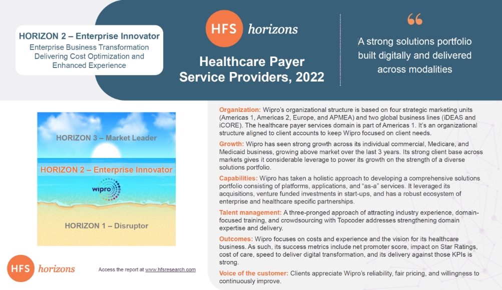 Global business research consultancy HFS named Wipro an Enterprise Innovator in its Horizons Healthcare Payer Service Providers 2022 report, citing Wipro’s “strong solutions portfolio built digitally and delivered across modalities.”
