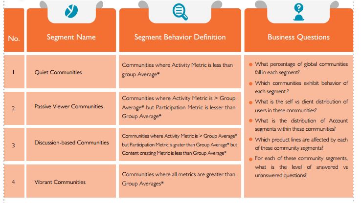 Let’s assume that a technology company has sold its product to 200 customers. Of the 200, we assume 20 are important customers from a revenue, usage and sales-promotion perspective. If these 20 customers are creating original content and their ideas are being leveraged by the other 180, one can assume the community health is good. Soon enough the engagement and interactions of the 20 customers will ensure the entire community becomes a vibrant source of ideas and advice. This could result in demand for existing products, new products and better ways to use existing products – self-help and troubleshooting. The host enterprise should pay careful attention to the conversation in such a community and use analytics to rapidly extract usable business information. But if the top 20 customers are not engaged, then it is a cause for concern because a major source of business information lies inactive. Immediate remedial steps need to be taken.