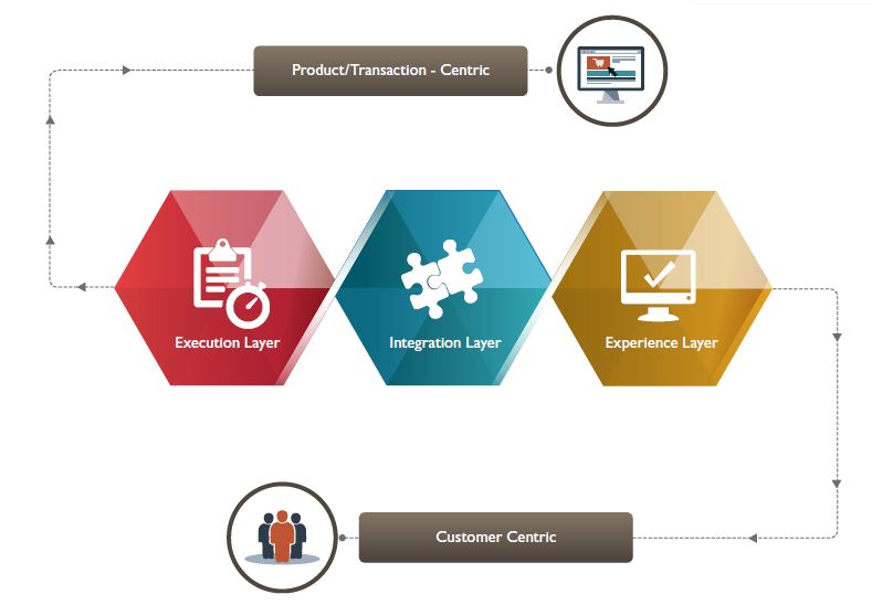 Customer Journey starts with an interaction at the experience layer. Every customer journey in the experience layer can be through a different channel and will interact with the execution layer to complete the process and transaction enabled by the ”integration layer”.