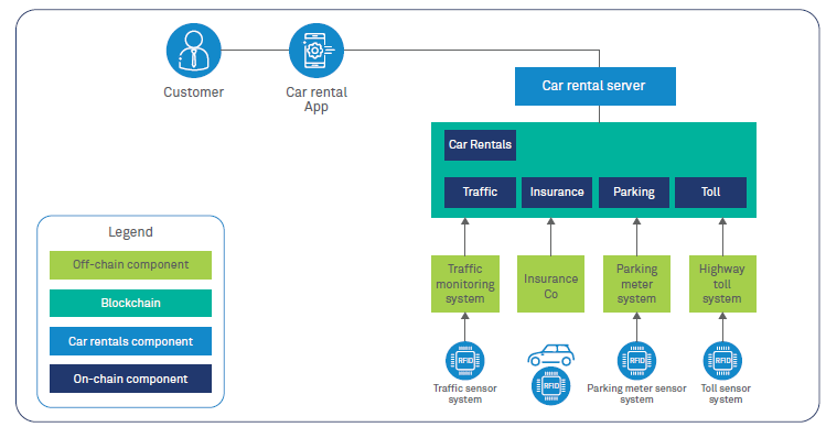 While the rental is in progress, the RFID tag on the car enables the traffic monitoring system to detect over-speeding; parking meters to capture the duration for which the car was parked; tollgates to record entry and exit points and compute applicable toll charges. This information is relayed to the Blockchain network in real-time.