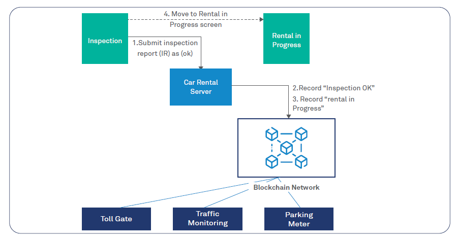 In the POC for the city of Dubai, a mobile app was created for initiating a car booking while Blockchain was used to simplify and link a variety of rental processes and the associated data. These included car booking, pickup, fines and charges accrued during rental and car return (see Figure 3). Hyperledger Fabric was chosen as the Blockchain platform and Oracle’s Cloud-based “Blockchain as a Service” was leveraged.