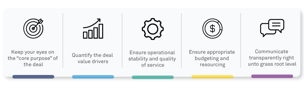 Lastly, it is rightly said that “well begun means half done”. Hence, don’t wait until the deal is announced and start integration planning right at the stage of due diligence. This provides you enough room to capture opportunities and manage potential contingencies.