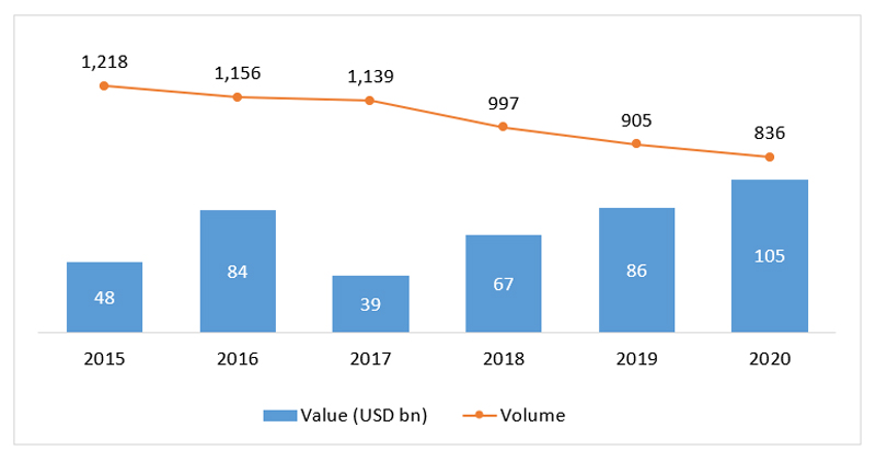 Interestingly, the average ticket size of a deal increased by 4x from $105 million in 2015 to $420 million in 2020 – indicating an increased confidence of capital market leaders to go for larger and strategic deals. In fact, capital markets sector witnessed the largest corporate merger of 2020, where S&P Global agreed to acquire IHS Markit for $44 billion to gain scale and efficiency from its complementary businesses.