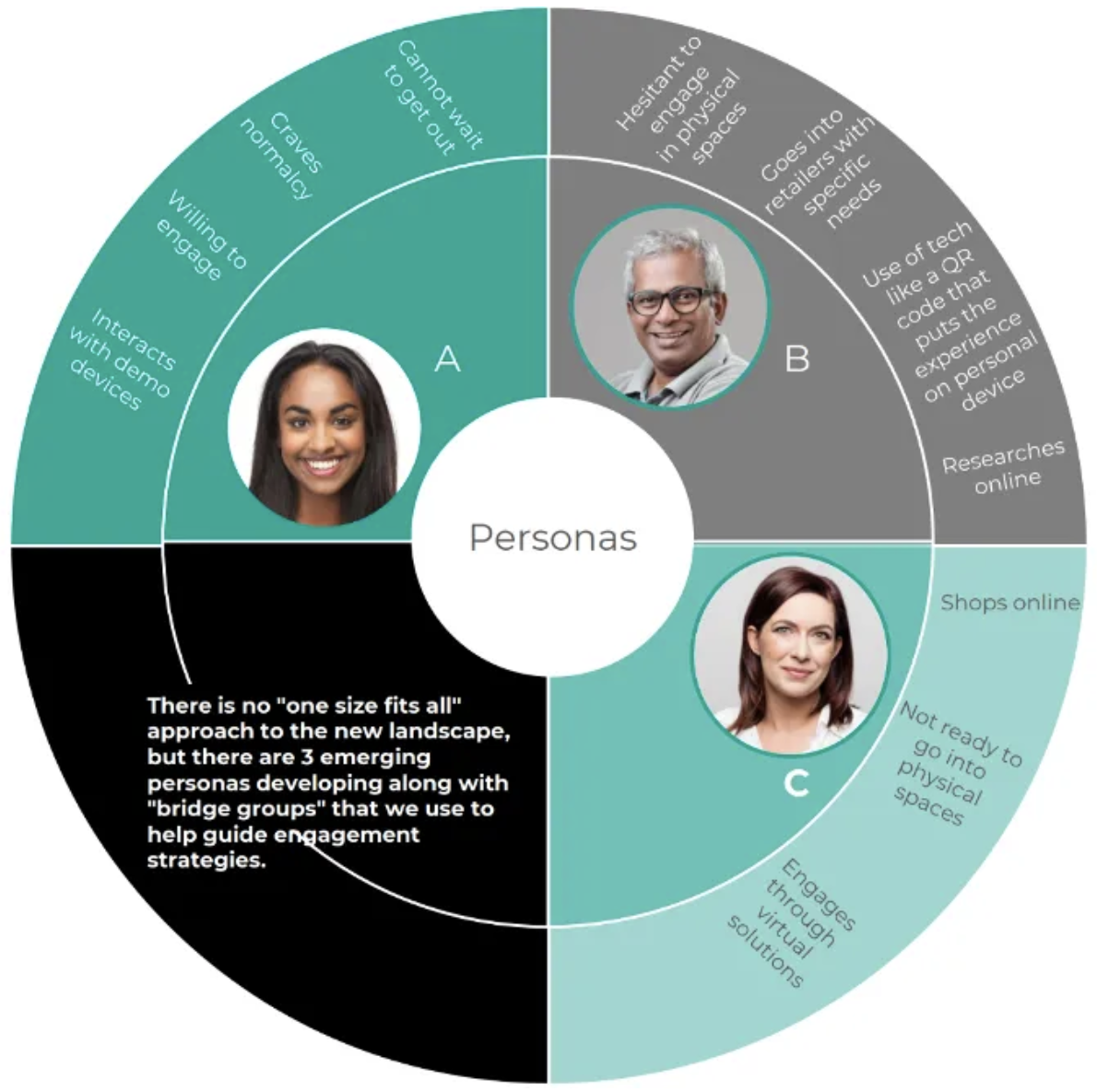 The first, Persona A, craves a sense of “normalcy”, cannot wait to get back into stores, and will be willing to engage with store associates. This persona represents the minority, but it should be noted that they will be more willing to interact with a demo device or compare products and services in person. Consider Persona B: They are more hesitant to engage in physical spaces, and thus will require a different solution. Perhaps Persona B has an aversion to touching devices in the store but is receptive to an in-store QR solution that allows for a non-tactile experience. Then there’s Persona C, who has shifted almost entirely to online shopping. While they no longer seek in-store experiences, they might readily embark on a virtual store tour customized to their retail preferences.