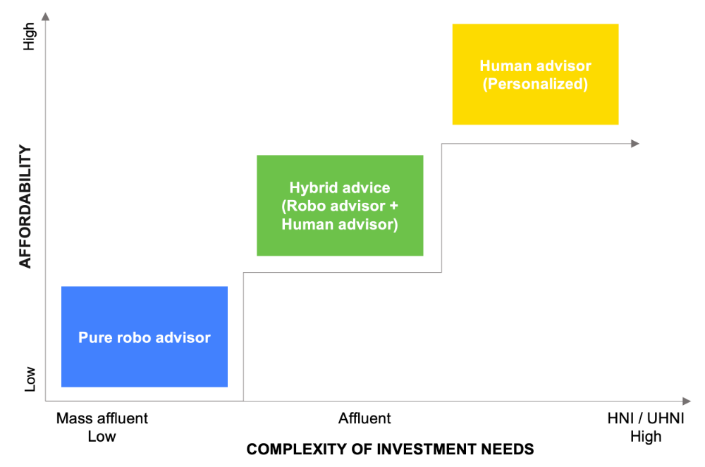 By embracing technological advancements, financial institutions can reduce their dependency on human-centric models to a more scalable digital model. However, to customers seeking both human and digital financial advice, firms need to adopt a hybrid approach that keeps human advisors relevant while developing robo advisors.