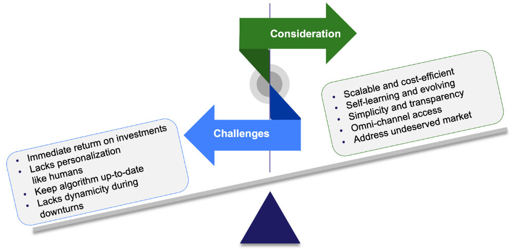 At one end, robo advisors can significantly cut costs and increase scalability. On the other hand, the cost and effort required to develop a digital robo advisor capable of providing personalized “human-like” financial advice is significant.