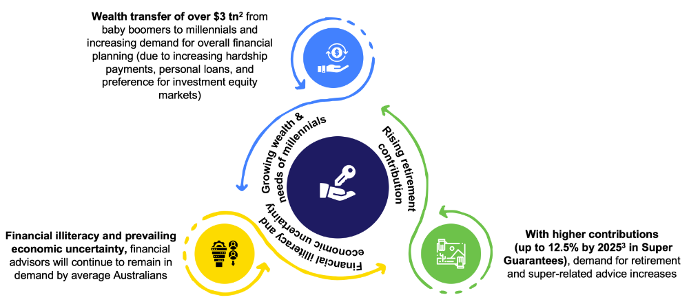 This is a unique opportunity for financial institutions like banking, super annuation and wealth management firms, as most of these entities offer advisory services through licensee organizations or independent financial advisors. However, with post-Royal commission interventions and amidst consolidation within the Australian wealth and super industry, over 9,000 financial advisors have exited the markets. By 2023, these numbers are expected to drop further, from 19,000 currently to 13,000, representing more than a 50% decline from 2018. This abrupt exit has created a significant supply-demand gap for existing customers, licensees, and associated institutions. That gap is likely to increase further by 2030, with Australia’s population expected to reach thirty million, and only seven million people expected to have access to a financial advisor
