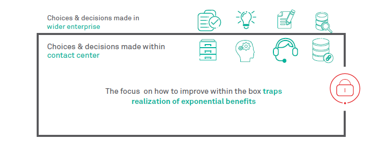 Contact center transformations have witnessed choices and decisions made in a rather siloed manner, with the focus on capabilities just within the contact center (box). Enterprises need to appreciate the fact that the contact center is a part of larger business operations and there are upstream and downstream handshakes to it. So trying to solve a part of the puzzle will provide incremental automation-led benefits but traps realization of exponential benefits at an enterprise level. Unlocking this exponential benefit is important as customers too are focused on getting an end-to-end resolution of their problems and aren’t looking at how well enterprises run their contact center operations.
