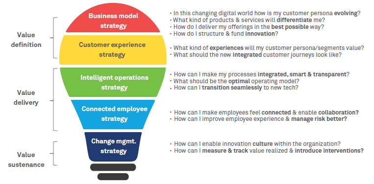 In the value delivery stage, the focus is on redefining the enterprise operating model to service the value definition construct. Emphasis is laid on managing both external and internal stakeholders. Enterprises must focus on making their own back-office operations easy and seamless for internal stakeholders to have better experiences and more time to focus on customers. Each component of the operating model i.e. underlying processes, technology, data, design, and people must be evaluated to service the propositions of the value-definition stage.