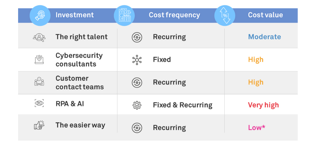 The investment you need to make here is recurrent and dependent on the volume of transactions that you deal with regularly and the level of training requirements.