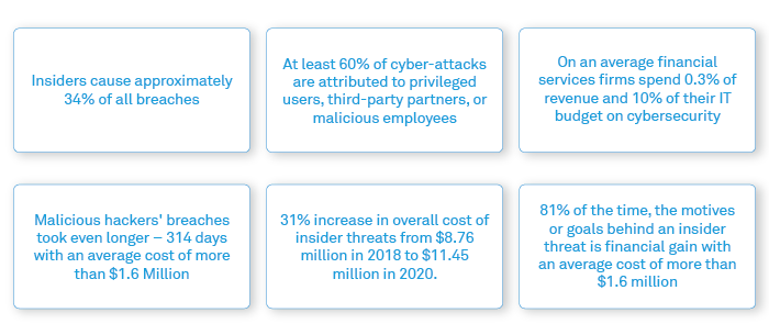 Cyber-attack threats are on the rise, and the cost of Cybercrime continues to increase in the financial services industry. In the next five years, Cybercrime cost is expected to increase by 40%. Although large-scale cyber-attacks have occurred over the past 15 years in the form of distributed denial of service, data theft, loss of intellectual property, and cyber fraud, their impact has grown faster than the firm’s ability to prevent and recover from it. Usually, organizations focus on external threats, but insiders are often more likely to be the cyber-attack source in Capital Markets. One of the largest global bank recently faced a loss of $900 million due to an insider breach; this is testimony to the fact that internal cyber-attacks are more common than many assume.