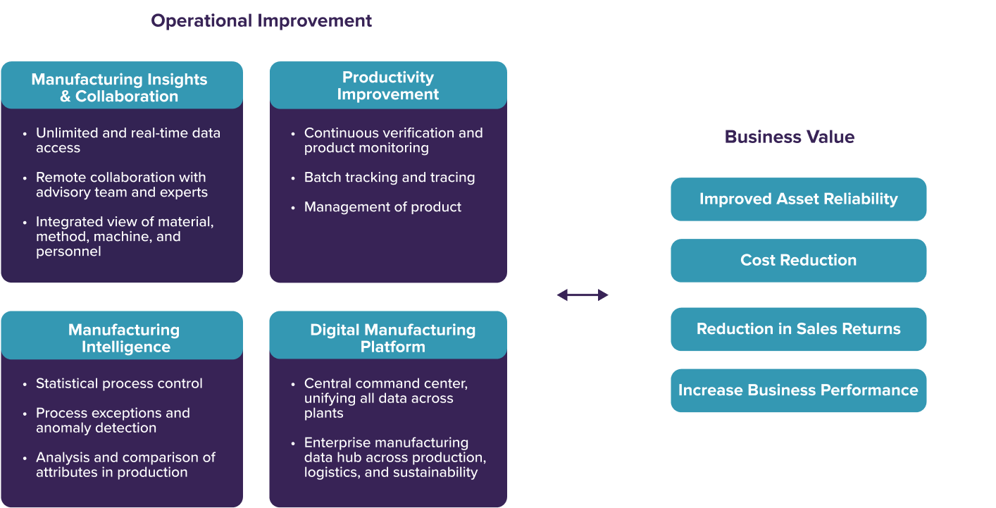 Legacy manufacturing enterprises are typically built around geographically dispersed production facilities reliant on siloed systems and information flows that are slow to deliver actionable data at either the local or organizational level. This clearly impacts local control of facility costs, quality, and productivity, requires skilled personnel to be constantly fire-fighting, and affects both asset life and availability. Just as importantly, without a source of real-time information, timely corporate-level data analysis and decision making is impossible, placing enterprises at a major disadvantage to their more connected peers who are running modern, integrated digital manufacturing platforms.