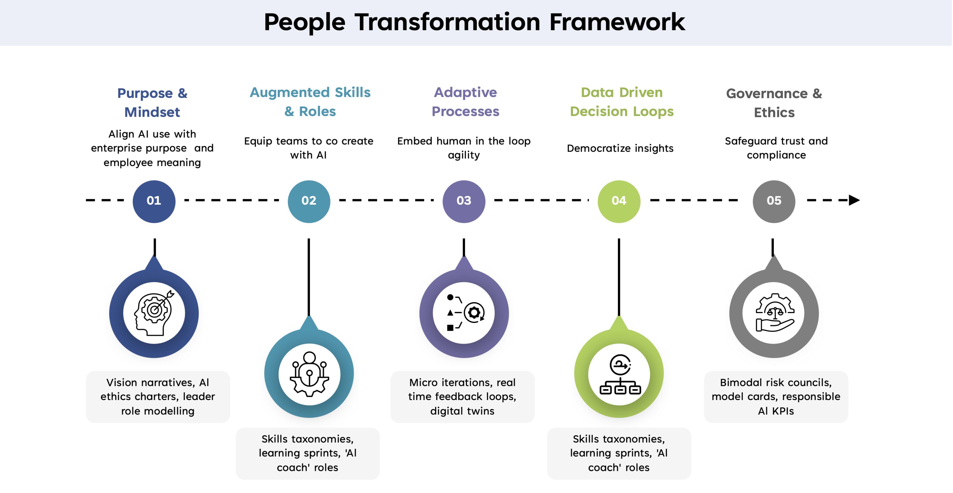 Digital tools alone rarely produce digital outcomes. Sustainable value arises when technology, talent, and teamwork move in unison. Our People Transformation Framework outlines five mutually reinforcing pillars that transform AI curiosity into enterprise-wide capability: