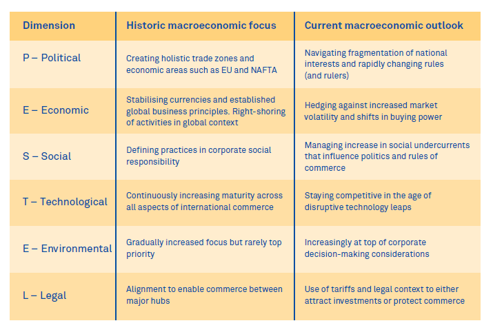As we enter a new age of dynamic uncertainty, a fragmented, disrupted, and volatile view of the world of commerce is replacing a more stable, integrated view, resulting in a number of shifts in macroeconomic focus. Below, we detail these shifts using Francis Aguilar’s 1960s six-dimensional PESTEL framework¹, a tool used to assess macro-environmental factors.