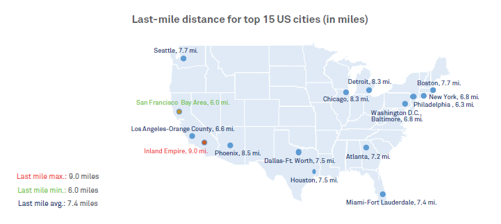 Figure 5: Last mile distance of new facilities (under 200,000 sq. ft.) for top 15 US cities (Source: CBRE Research and U.S. Census Bureau) 5