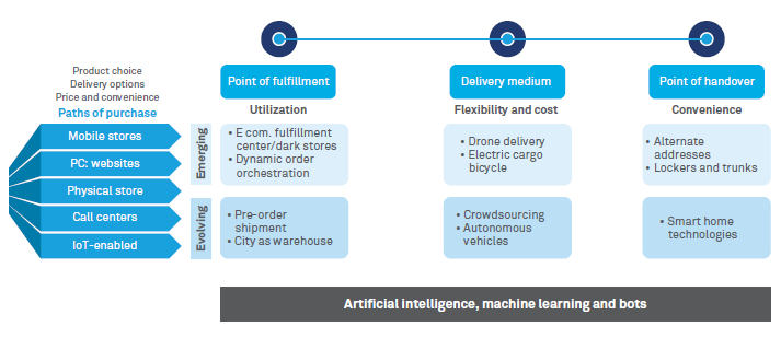 Successfully orchestrating orders to reach the last mile requires a combination of solutions. Currently, these solutions are either emerging (adopted or in process of being scaled), or evolving (in development and under pilots). We can break these solutions down into three areas: