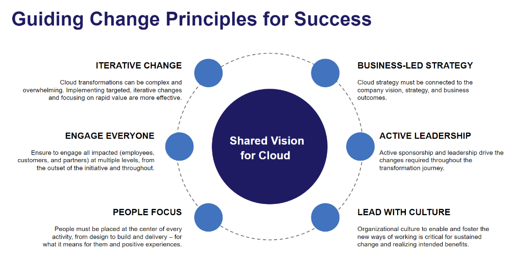 Cloud migration programs can be overwhelming for the technology and project teams to manage. A program can include one or more significant technological changes for the organization such as different ways to harness data, infrastructure services, on-demand software applications, machine learning and smart development. From a people and process perspective, these changes are complex, impacting people across the organization in different ways. There may be role changes, requirements for new skills and compliance and security policy changes that could impact the entire organization. To manage all this change successfully, it is essential to shift the employee mindset and organizational culture toward agile principles. This is the most challenging aspect of the technology transformation.