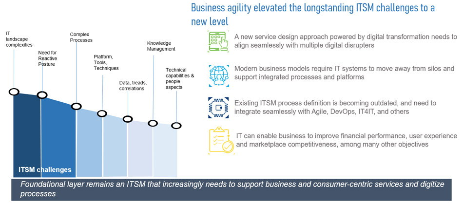 In today’s world, virtually every sector and every enterprise function has been disrupted by digital transformation – including information technology (IT), the nervous system of any business. Facilitating digital transformation is central to the IT function; IT, after all, facilitates the adoption of technologies and solutions that make digital work. But how enterprises manage the “business of IT” also needs radical transformation to thrive in the digital era. In order to provide quality services and meet enterprise expectations, many IT processes and operating models require transformation, including IT Service Management (ITSM).