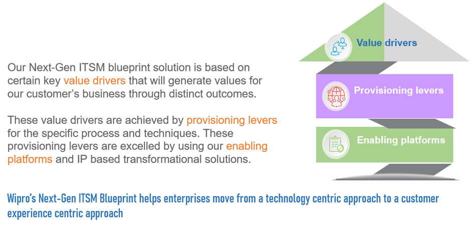 Wipro’s Next-Gen ITSM Blueprint is based on these core principles: Value Drivers, which refer to the core outcomes for a specific enterprise and sector. Provisioning Levers represent the a set of levers that Wipro will apply to achieve the Value Drivers. Enabling Platforms represent Wipro’s underlying technology and platform solutions make it all possible.