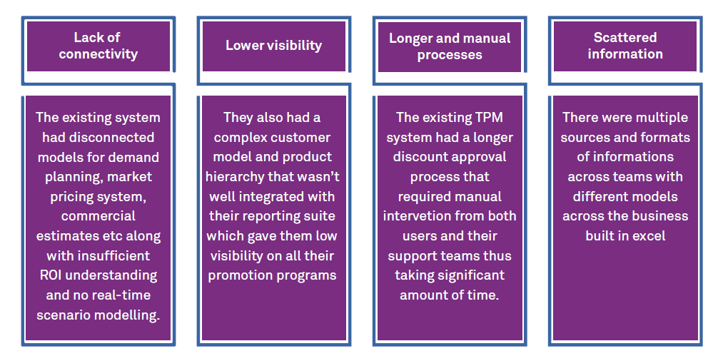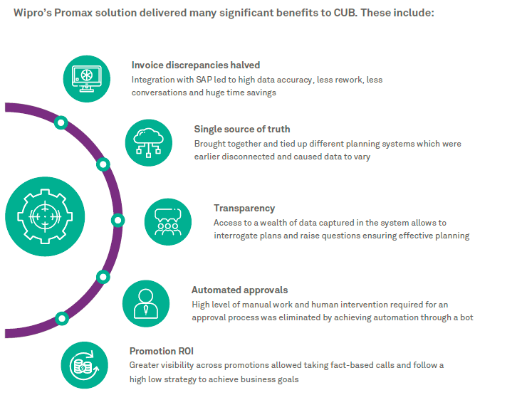 Tools – It started with Wipro’s Promax TPM tool that supported customization as per CUB's business requirements. It offered an easy-to-use system that addressed their complex customer model and product hierarchy, and offered real-time scenario modelling along with the ability to integrate with client’s ERP system.