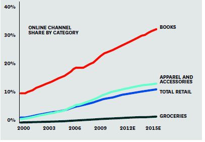 Today, however, that economic reality is well established. The research firm Forrester estimates that e-commerce is now approaching $200 billion in revenue in the United States alone and accounts for 9% of total retail sales, up from 5% five years ago. The corresponding figure is about 10% in the United Kingdom, 3% in Asia-Pacific, and 2% in Latin America. Globally, digital retailing is probably headed toward 15% to 20% of total sales, though the proportion will vary significantly by sector. Moreover, much digital retailing is now highly profitable. Amazon’s five-year average return on investment, for example, is 17%, whereas traditional discount and department stores average 6.5%.