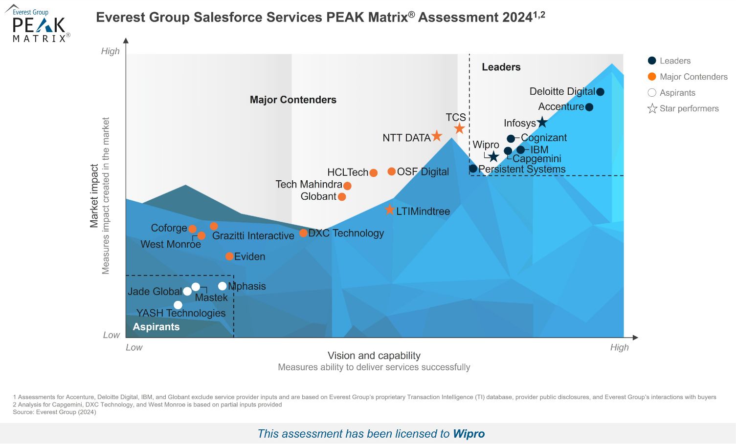Wipro wird im Everest Group Salesforce Services PEAK Matrix Assessment® 2024 als Leader und Star Performer ausgezeichnet. Das Ranking zeigt eine deutliche Verbesserung sowohl unserer Salesforce-Angebote als auch ihrer Marktleistung im Vergleich zum Vorjahr. Mit dem Ziel, durch die Nutzung von KI, CRM und Daten zur Verbesserung des Kundenlebenszyklus der weltweit führende Salesforce-Dienstleister zu sein, konzentriert sich Wipro auf branchenspezifische Lösungen, digitale Prozesse und Partnerschaften, um Innovationen voranzutreiben und Mehrwert zu schaffen.