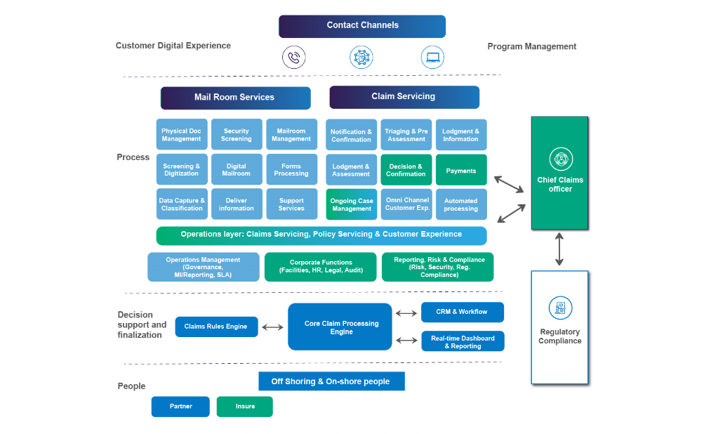 CaaS model brings together multiple solution blocks with omnichannel customer interaction capabilities and digitally-enabled processes. It will result in a highly scalable and modular solution by integrating operations, corporate functions, core (Legacy) systems, CRM, and claims processing engine to meet insurance regulatory reporting and program management requirements, as depicted in figure 2.