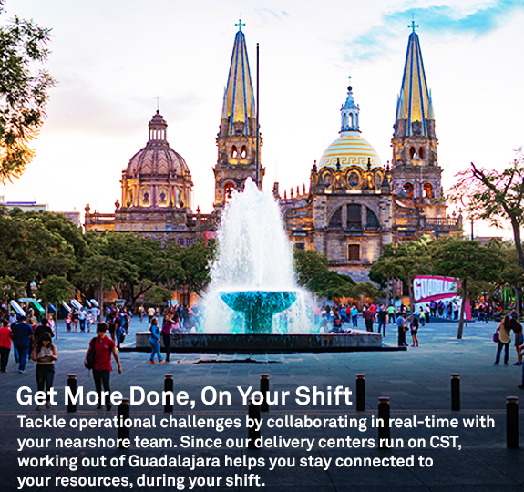 And to top it all off, our Mexico delivery centers are aligned to North American work day cycles. By moving your operations to Guadalajara, you’ll unlock all the business benefits of outsourcing, while living and working mere hours from your business headquarters.