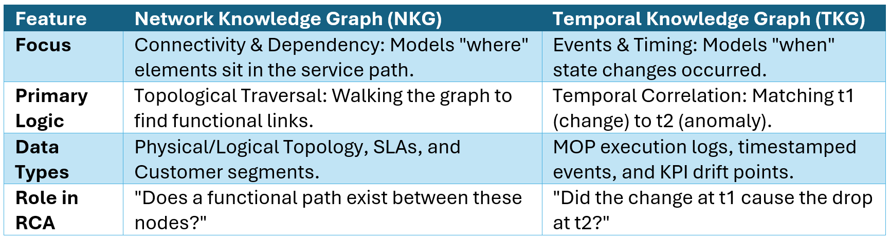 Every planned change (a Method of Procedure, or MOP) is logged as a timestamped relationship: (MOP-ID-X, Alters, CNF-A, Time t₁). Every anomalous event is similarly logged: (Router-B, Experiences, Latency Spike, Time t₂). This granularity transforms the TKG from a simple event log into a causal reasoning engine - one that can answer "did t₁ cause t₂?" rather than just "did t₁ happen before t₂?"