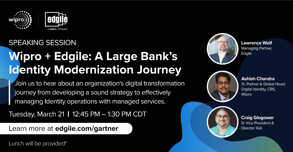 Deep dive into how Wipro and Edgile enabled First Citizens Bank to modernize their identity program. Hear from Craig Glogower, Sr. Vice President of a large national bank, in an insightful session hosted by Larry Wolf Managing Partner, Edgile, and Ashish Chandra, Digital Identity Global Head, Wipro.