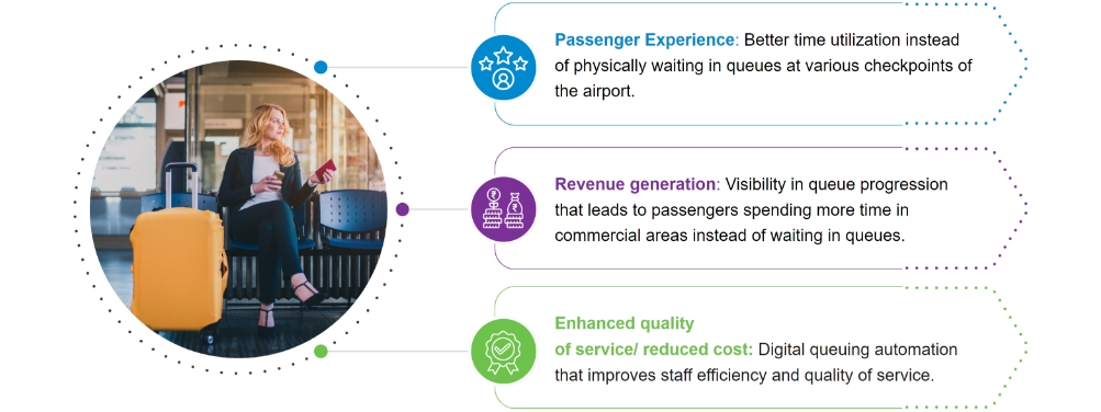 Virtual Queue Management System ensures passengers can join queues remotely (via a QR code or a link), monitors queue status, and dynamically manages them (counter and queue number allocation) using predictive analytics based on customer profiles, travel schedules, and customer standard classifications. The system can be integrated with FIDS, employee resource management, and Airline Operations Control Center. Airports using the system can easily integrate it with advertising solutions that improve revenue and with email and SMS gateways for passenger alerts and notifications. The benefits of the Virtual Queue Management System include the following: