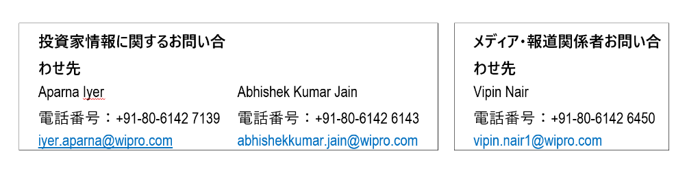 ここに含まれる将来予想に関する記述は、将来の出来事に関するウィプロの見解を表すものであり、その多くは本質的に不確実であり、ウィプロの管理が及ばないものです。そうした記述には、ウィプロの成長見通し、当社の将来の財務業績、当社の計画・期待・意図についての記述が含まれますが、これらに限定されません。ここに含まれる将来の見通しに関する記述は、実際の結果がそのような記述によって予想される結果と大きく異なる可能性があるリスクと不確実性が伴うことにご注意ください。そうしたリスクと不確実性には、当社の収入・収益・利益の変動、成長を創出・管理する当社の能力、提案した企業活動を完遂する当社の能力、ITサービスにおける激しい競争、コスト優位性を維持する当社の能力、インドにおける賃金の上昇、高度なスキルのある専門的人材を惹きつけて維持する当社の能力、固定価格・固定期間の契約での時間とコストの超過、顧客の集中、移民の制限、国際事業を管理する当社の能力、当社の重点分野の技術への需要の減少、通信ネットワークの障害、潜在的な買収を成功裏に完了および統合する当社の能力、当社サービス契約の損害賠償責任、当社が戦略的投資を行う企業の成功、政府の財政インセンティブの取り下げ、政治的不安定、戦争、インド国外での資金調達または企業買収に関する法的制限、当社の知的財産の不正使用、および当社のビジネスや業界に影響を与える一般的な経済状況のリスクと不確実性が含まれますが、これらに限定されません。