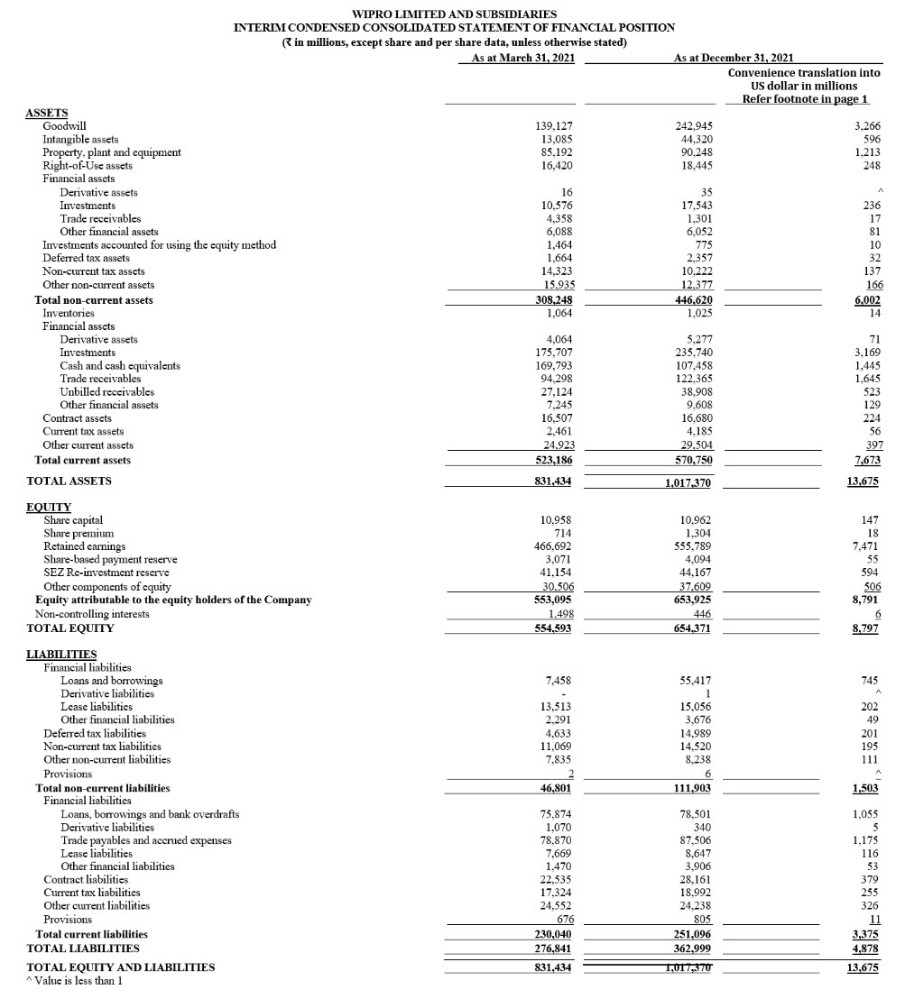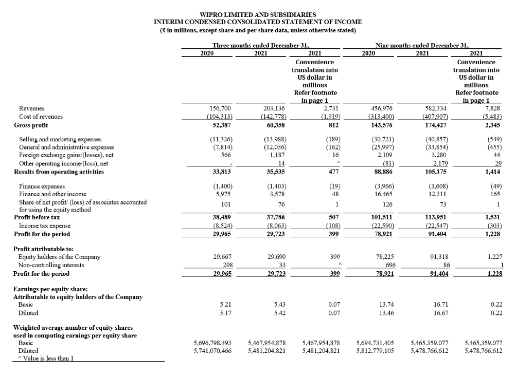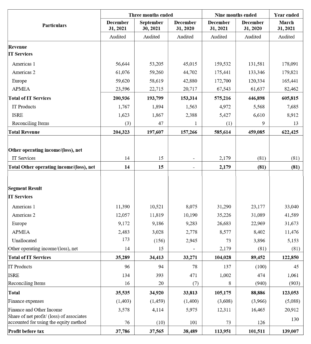 IFRSに基づいて作成された2021年12月31日終了の四半期の業績、および各事業セグメントの報告書は、当社ウェブサイト(www.wipro.com)の「Investors」セクションでご覧いただけます。