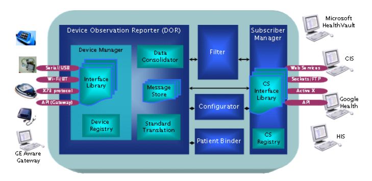 The overall solution of EMRGateway is based on IHE architecture which consists of Device Observation Reporter (DOR), Device observation Filter (DOF) and Device observation Consumer (DOC)
