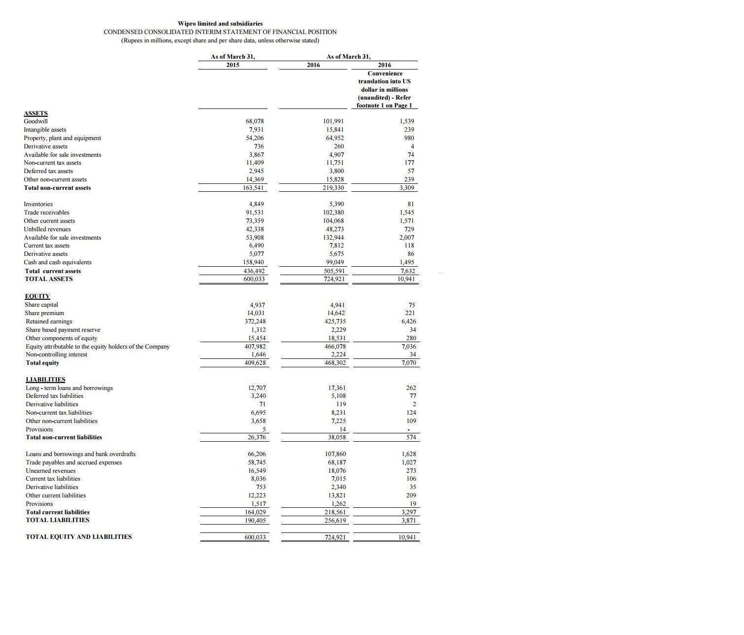 Results for the quarter and year ended March 31, 2016, prepared under IFRS, along with individual business segment reports, are available in the Investors section of our website www.wipro.com.