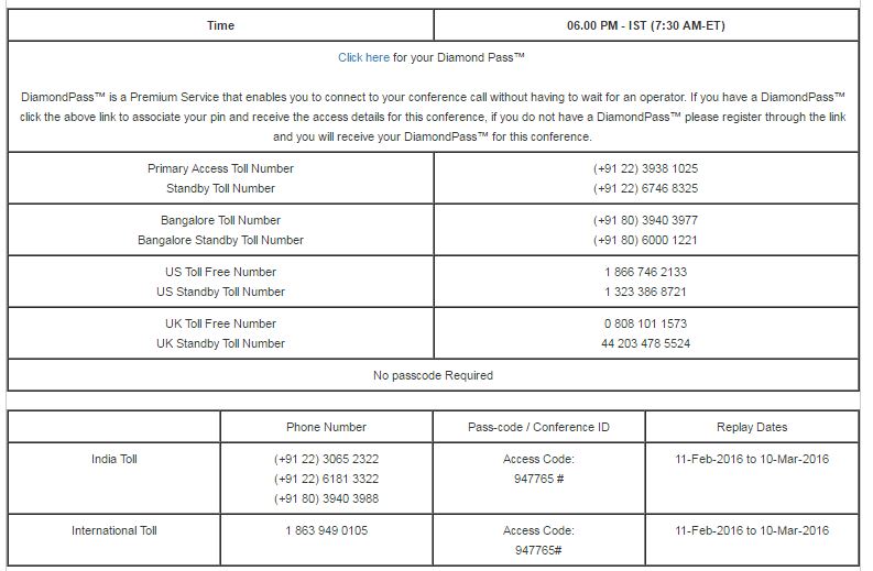 We will hold a conference call today at 6.00 PM Indian Standard Time (7:30 A.M. US Eastern Time) to discuss the acquisition. The audio from the conference call will be available over a bridge as well as online through a web-cast and can be accessed at the following hyperlink Click here