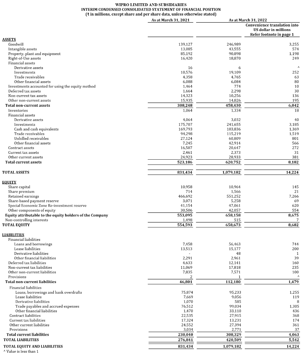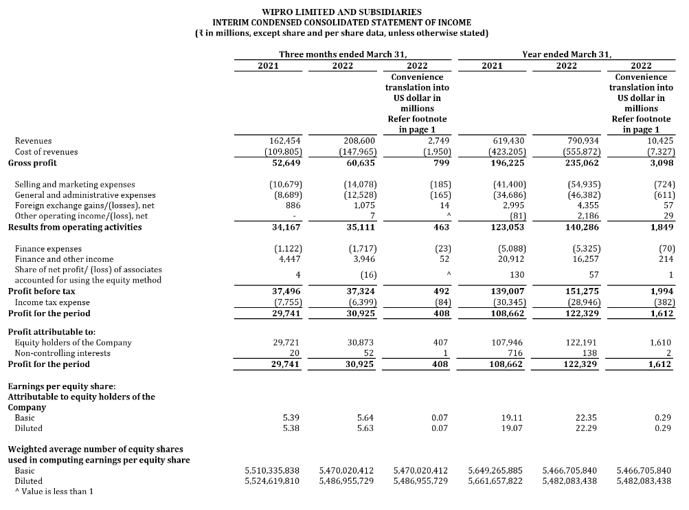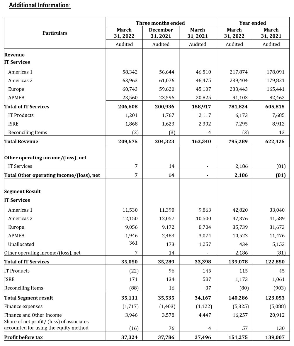 Results for the Quarter and Year ended March 31, 2022, prepared under IFRS, along with individual business segment reports, are available in the Investors section of our website www.wipro.com