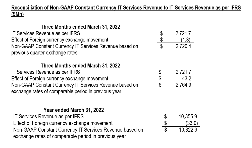 The table on page 9 provides IT Services Revenue on a constant currency basis, which is a non-GAAP financial measure that is calculated by translating IT Services Revenue from the current reporting period into U.S. dollars based on the currency conversion rate in effect for the prior reporting period. We refer to growth rates in constant currency so that business results may be viewed without the impact of fluctuations in foreign currency exchange rates, thereby facilitating period-to-period comparisons of our business performance. Further, in the normal course of business, we may divest a portion of our business which may not be strategic. We refer to the growth rates in both reported and constant currency adjusting for such divestments in order to represent the comparable growth rates.