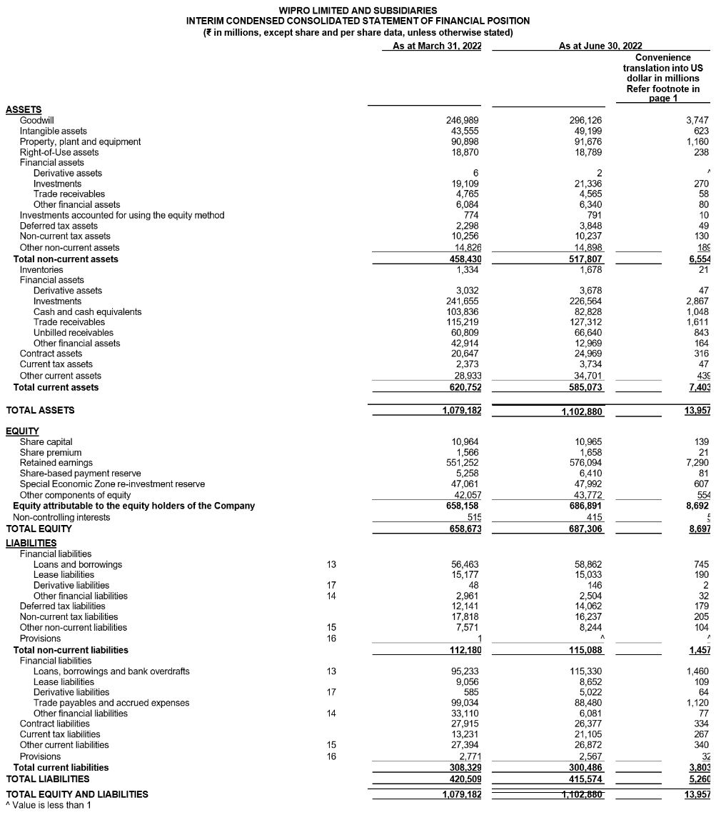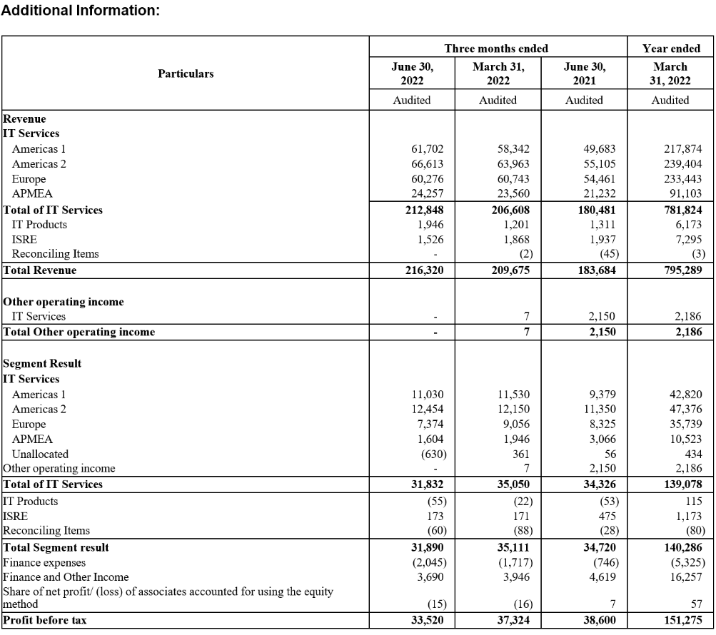 Results for the Quarter ended June 30, 2022, prepared under IFRS, along with individual business segment reports, are available in the Investors section of our website www.wipro.com