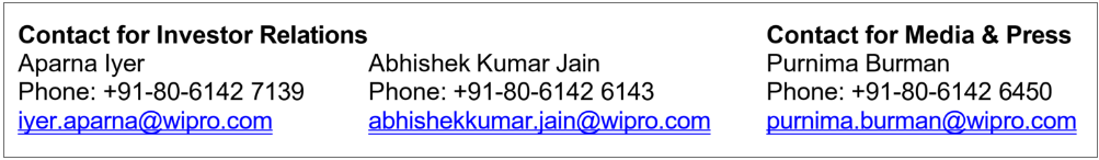 Wipro Limited (NYSE: WIT, BSE: 507685, NSE: WIPRO) is a leading technology services and consulting company focused on building innovative solutions that address clients’ most complex digital transformation needs. Leveraging our holistic portfolio of capabilities in consulting, design, engineering, and operations, we help clients realize their boldest ambitions and build future-ready, sustainable businesses. With over 240,000 employees and business partners across 66 countries, we deliver on the promise of helping our customers, colleagues, and communities thrive in an ever-changing world. For additional information, visit us at www.wipro.com