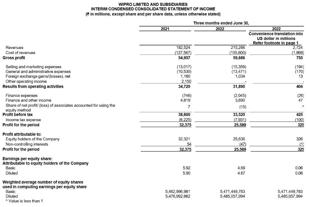 New York, USA and Bangalore, India – July 20, 2022: Wipro Limited (NYSE: WIT, BSE: 507685, NSE: WIPRO), a leading technology services and consulting company, announced financial results under International Financial Reporting Standards (IFRS) for the quarter ended June 30, 2022.