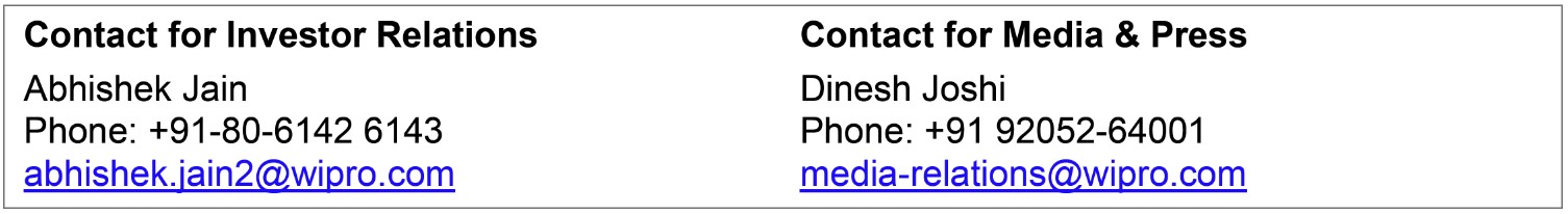 Wipro Limited (NYSE: WIT, BSE: 507685, NSE: WIPRO) is a leading AI-powered technology services and consulting company focused on building innovative solutions that address clients’ most complex digital transformation needs. Leveraging our consulting-led approach and the Wipro Intelligence™ unified suite of AI-powered platforms, solutions and transformative offerings, we help clients realize their boldest ambitions to build intelligent and sustainable businesses. The Wipro Innovation Network – part of the Wipro Intelligence™ suite – underpins our commitment to client-centric co-innovation and co-creation by bringing together capabilities from the innovation labs and partner labs, academia, and global tech communities. With over 230,000 employees and business partners across 65 countries, we deliver on the promise of helping our customers, colleagues, and communities thrive in an ever-changing world. For additional information, visit us at www.wipro.com.