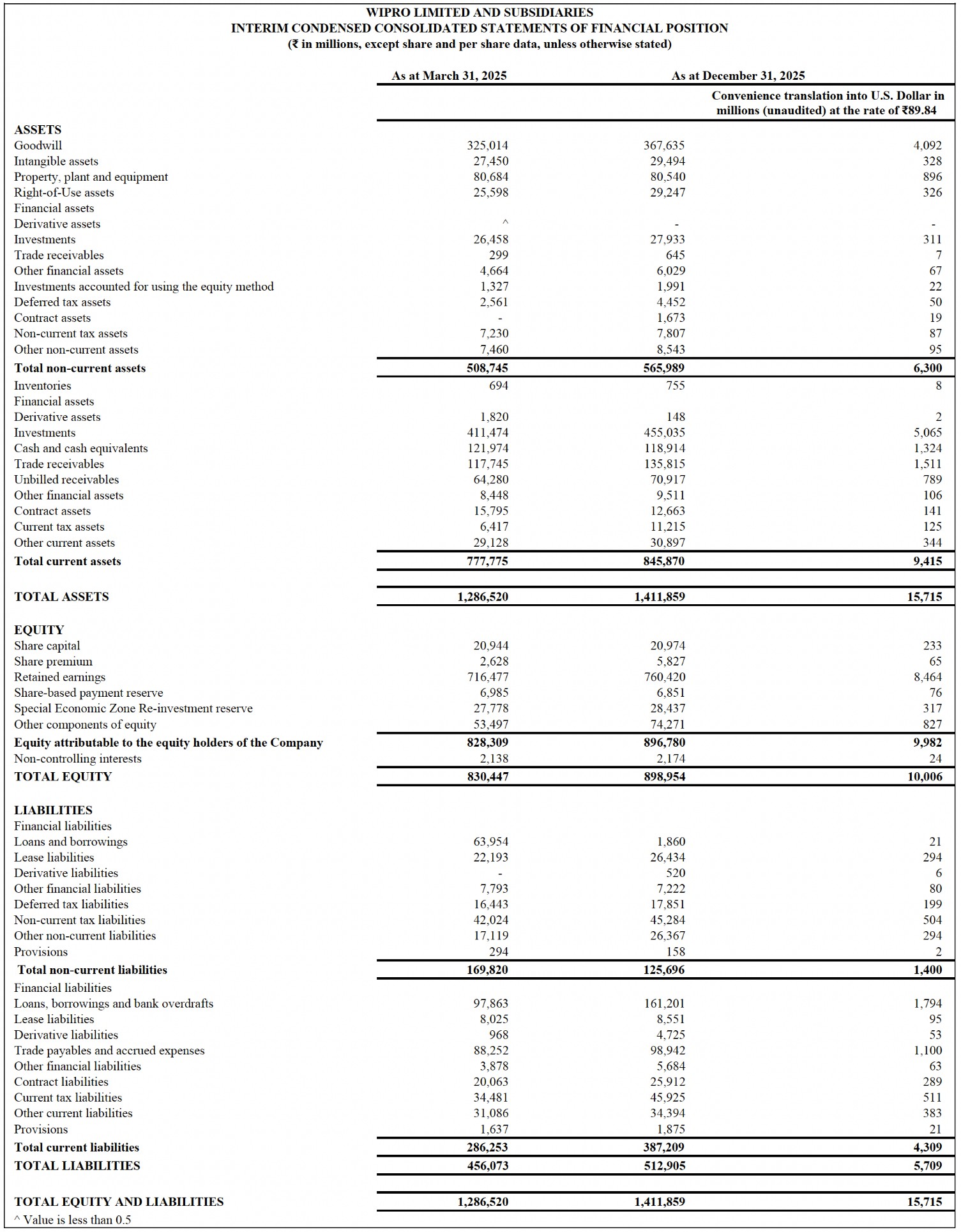 - For the convenience of the readers, the amounts in Indian Rupees in this release have been translated into United States Dollars at the certified foreign exchange rate of US$1 = ₹89.84, as published by the Federal Reserve Board of Governors on December 31, 2025. However, the realized exchange rate in our IT Services business segment for the quarter ended December 31, 2025, was US$1= ₹88.71