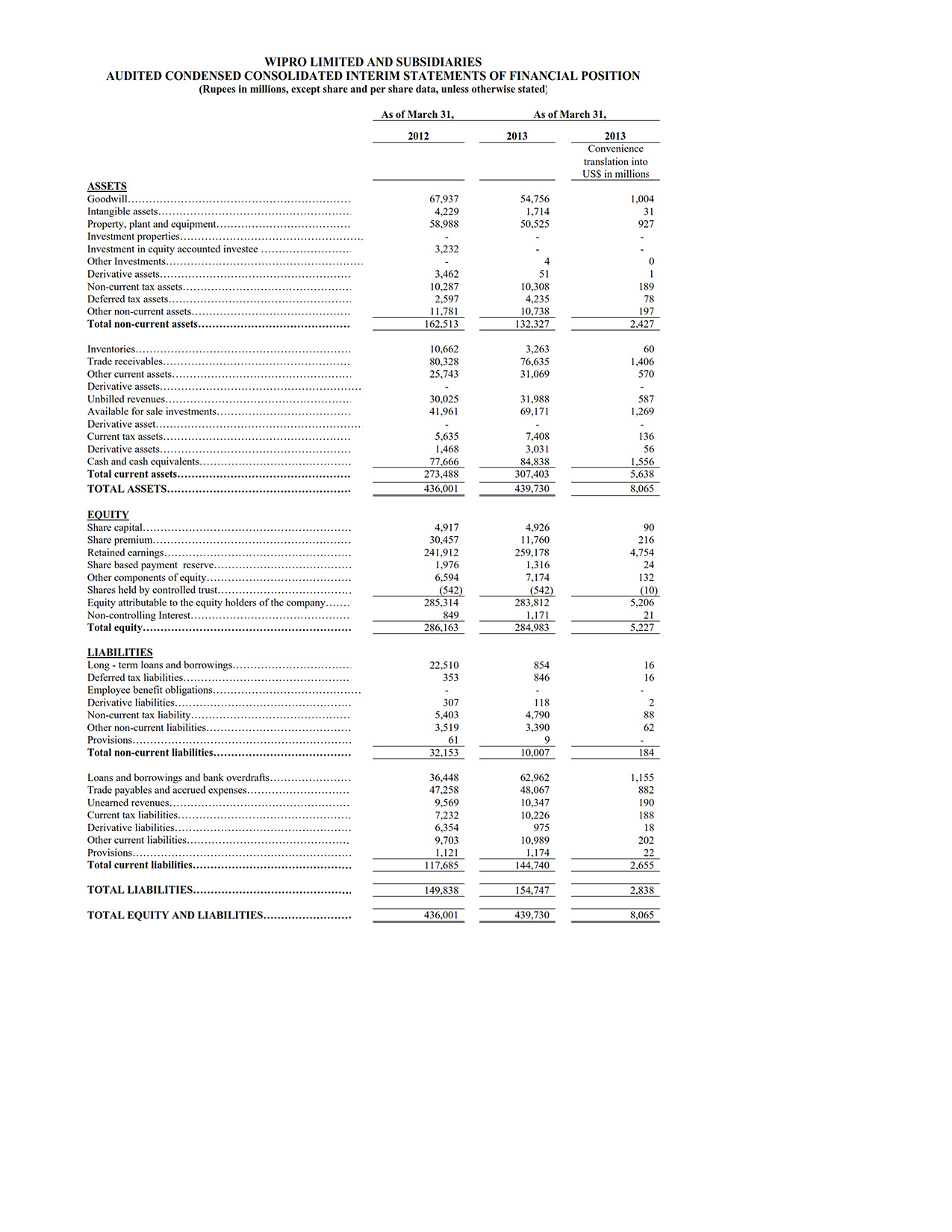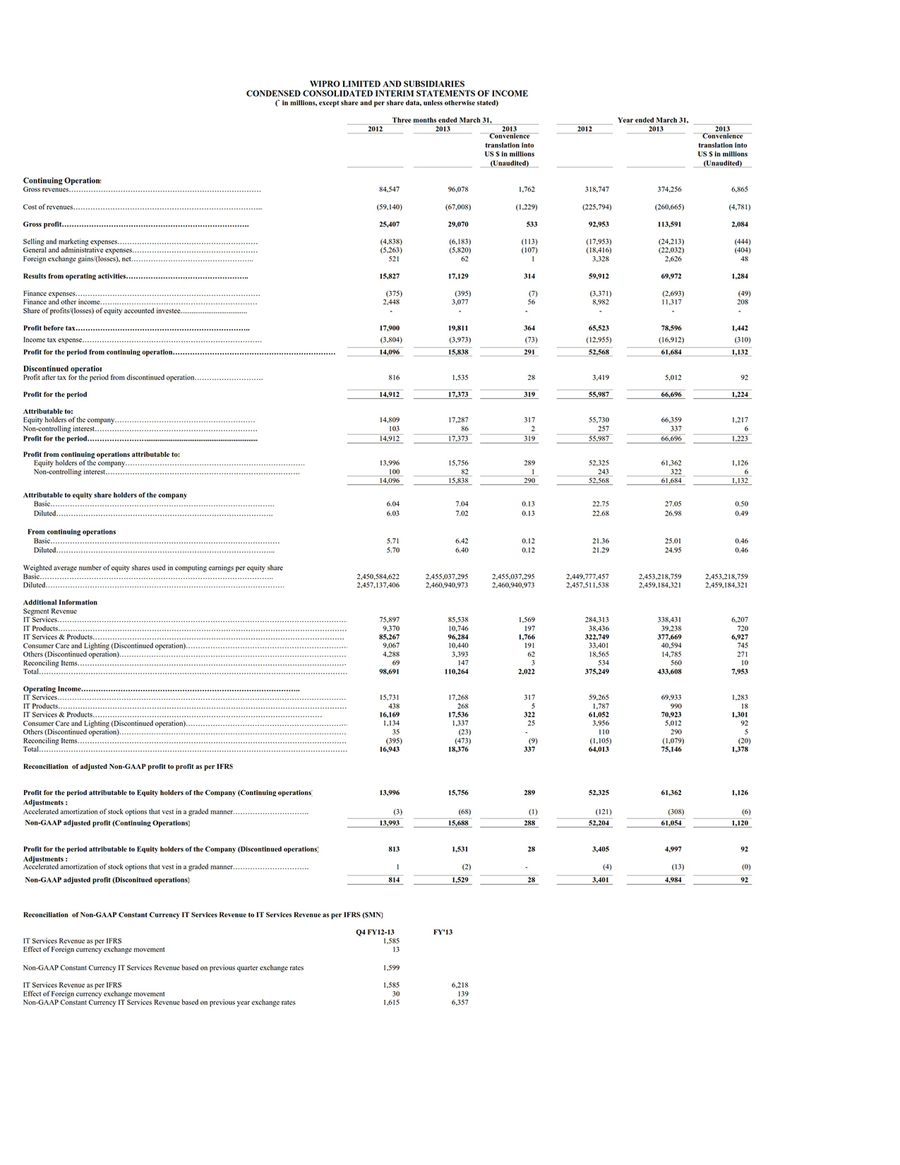 Results for the quarter and year ended March 31, 2013, computed under IFRS, along with individual business segment reports, are available in the Investors section of our website at www.wipro.com.