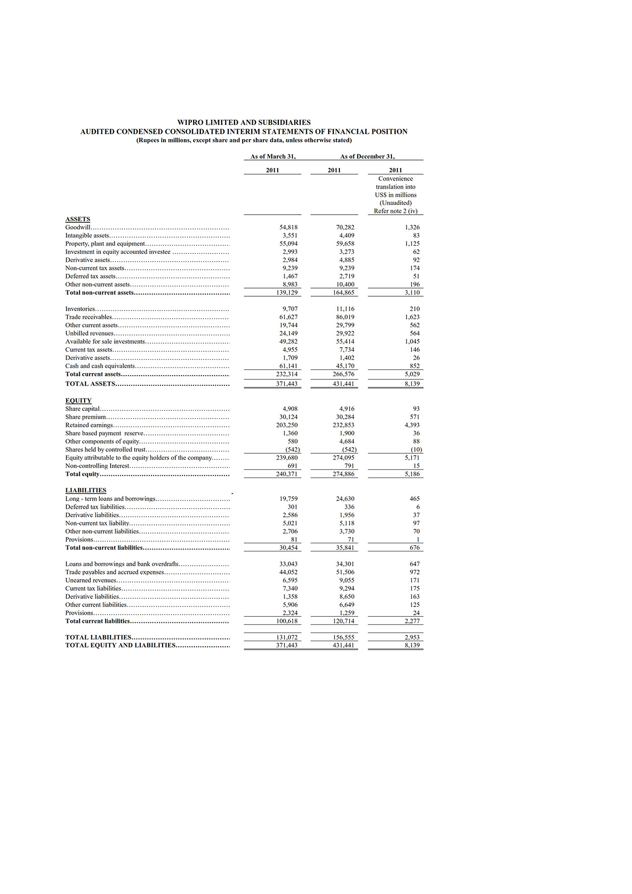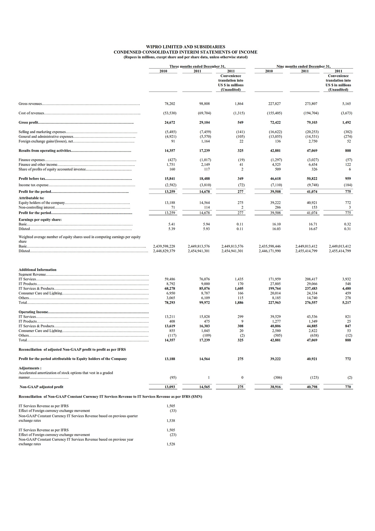 Results for the quarter ended December 31, 2011, computed under IFRS, along with individual business segment reports, are available in the Investors section of our website at www.wipro.com.