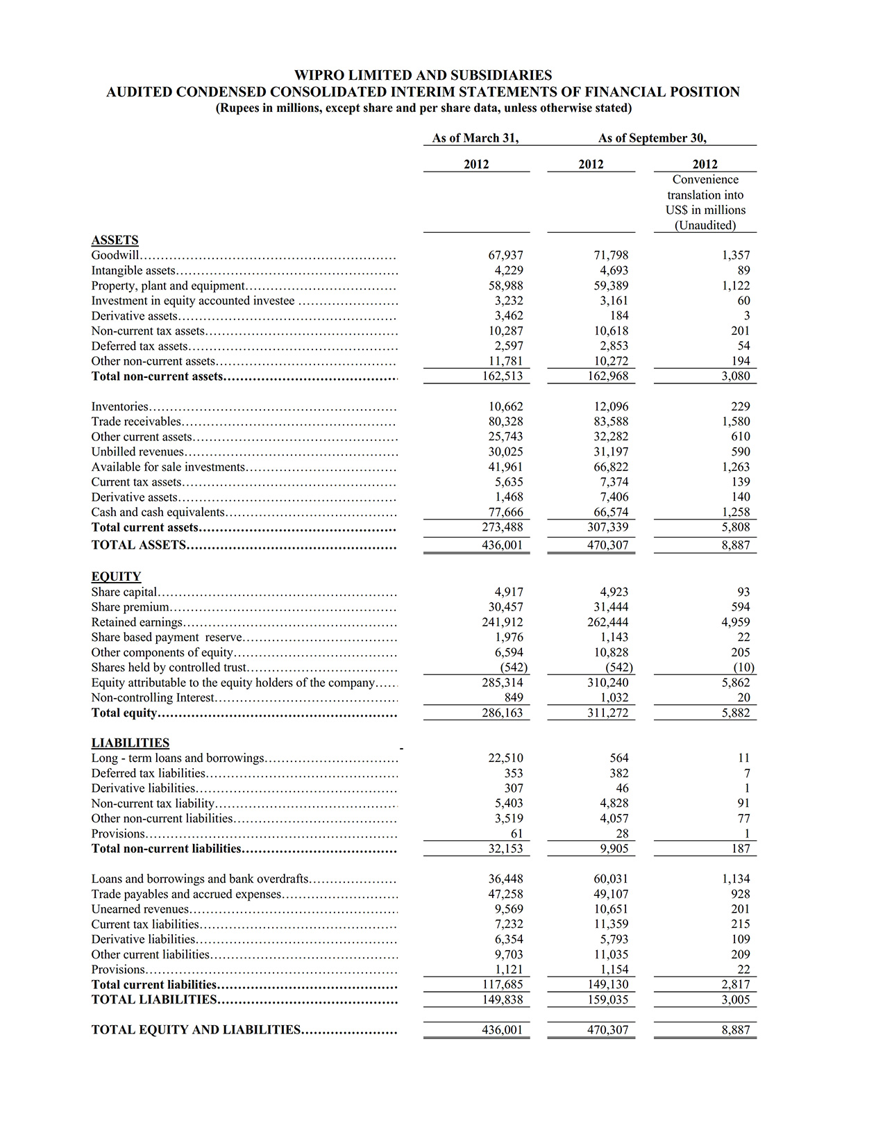The forward-looking statements contained herein represent Wipro’s beliefs regarding future events, many of which are by their nature, inherently uncertain and outside Wipro’s control. Such statements include, but are not limited to, statements regarding Wipro’s growth prospects, its future financial operating results, and its plans, expectations and intentions. Wipro cautions readers that the forward-looking statements contained herein are subject to risks and uncertainties that could cause actual results to differ materially from the results anticipated by such statements. Such risks and uncertainties include, but are not limited to, risks and uncertainties regarding fluctuations in our earnings, revenue and profits, our ability to generate and manage growth, intense competition in IT services, our ability to maintain our cost advantage, wage increases in India, our ability to attract and retain highly skilled professionals, time and cost overruns on fixed-price, fixed-time frame contracts, client concentration, restrictions on immigration, our ability to manage our international operations, reduced demand for technology in our key focus areas, disruptions in telecommunication networks, our ability to successfully complete and integrate potential acquisitions, liability for damages on our service contracts, the success of the companies in which we make strategic investments, withdrawal of fiscal governmental incentives, political instability, war, legal restrictions on raising capital or acquiring companies outside India, unauthorized use of our intellectual property, and general economic conditions affecting our business and industry. Additional risks that could affect our future operating results are more fully described in our filings with the United States Securities and Exchange Commission, including, but not limited to, Annual Reports on Form 20-F. These filings are available at www.sec.gov. We may, from time to time, make additional written and oral forward-looking statements, including statements contained in the company’s filings with the Securities and Exchange Commission and our reports to shareholders. We do not undertake to update any forward-looking statement that may be made from time to time by us or on our behalf.